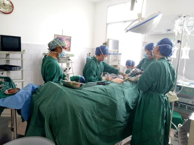高丽娟(右一)指导科室开展科室首例腹腔镜手术