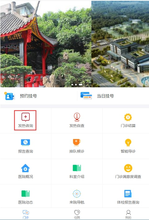 二、发热自查操作流程:进入“门诊”界面,点击“发热自查”,根据提示回答问题即可。