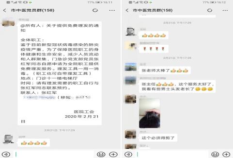 原来,为了解决医院职工们的“头等大事”,保障他们的身体健康和生命安全,减少人员流动和人群聚集,张红军自愿申请利用休息时间为全院职工提供免费理发服务。