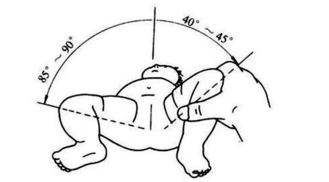 孩子平卧在床上,膝关节抬起,像青蛙的姿势一样向两侧外展,观察婴儿的大腿是否能基本触及床面。两膝均能触及床面为正常,如有一侧或双侧不能触及床面,就应及时到医院检查。