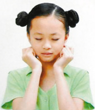 用双手食指分别按在两侧穴位处。大拇指抵在下颌凹陷处,其它手指握紧。每拍一圈,做四个八拍。