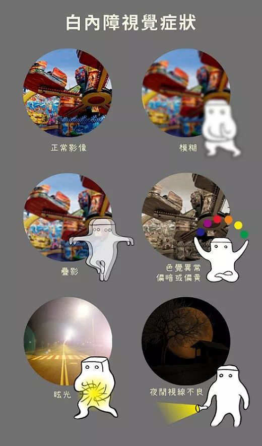 最常见的症状是:“视界”变得有云雾,模糊;物体颜色似乎变淡了;大灯、太阳光等会让你觉得太亮,光线周围还会出现光晕;夜间视力变差;眼镜度数经常变化等。