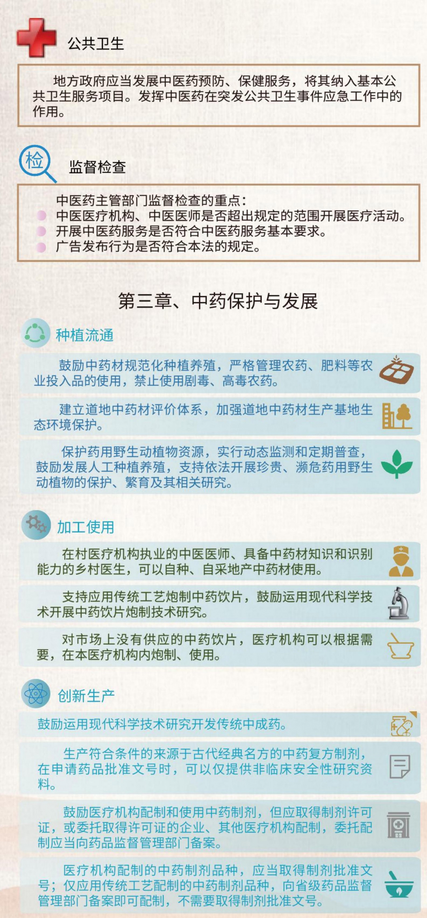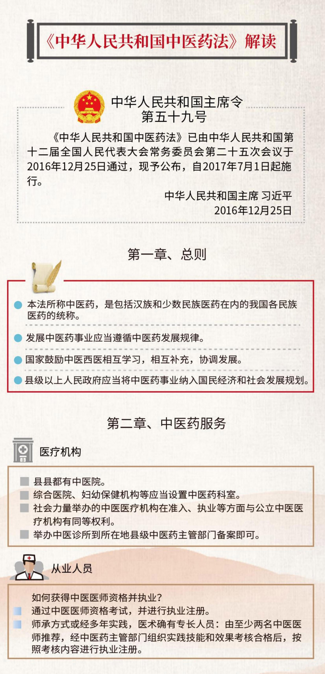 《中华人民共和国中医药法》(简称《中医药法》)是我国第一部全面、系统体现中医药特点的综合性法律。《中医药法》内容全面丰富,在具体制度设计中遵循中医药发展规律,体现了中医药自身特点,符合行业和民众期盼,符合中医药发展实际,具有很强的指导性、规范性和实用性。