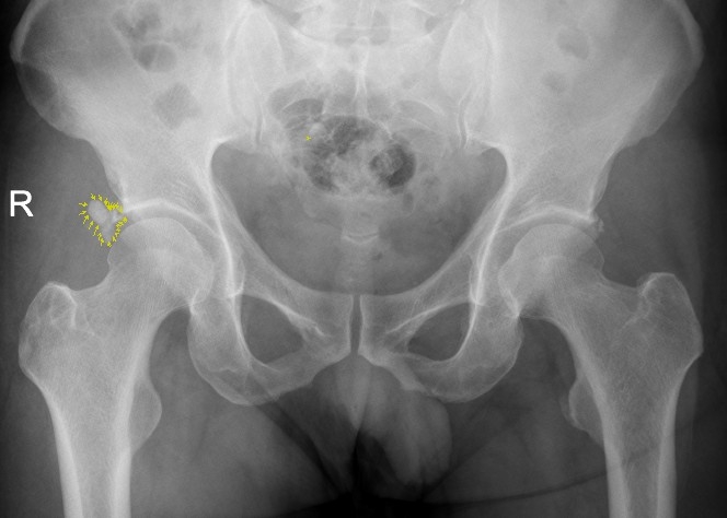 该患者为男性患者,47岁。右髋部疼痛7个多月,曾断续就医,未明确诊断,疼痛时缓时重。入院前两天,右髋部剧烈疼痛,患髋不能伸直,只能左侧卧位,谓之“坐卧不宁”,需家人搀扶下才能勉强行走。经临床经验丰富的骨三科主任、主任中医师李彬以“右髋关节盂唇病变”收入住院治疗,经X光核磁共振检查,患者右髋关节盂唇钙化。