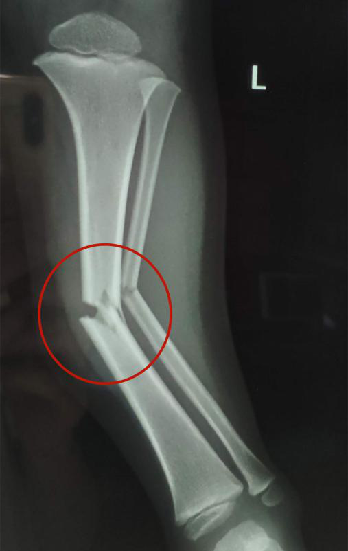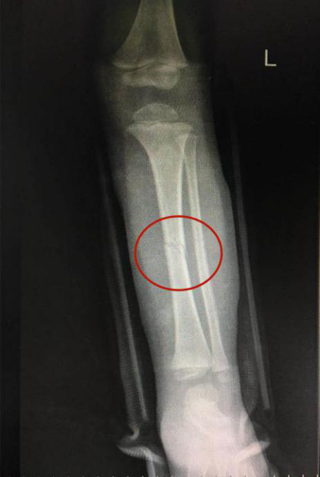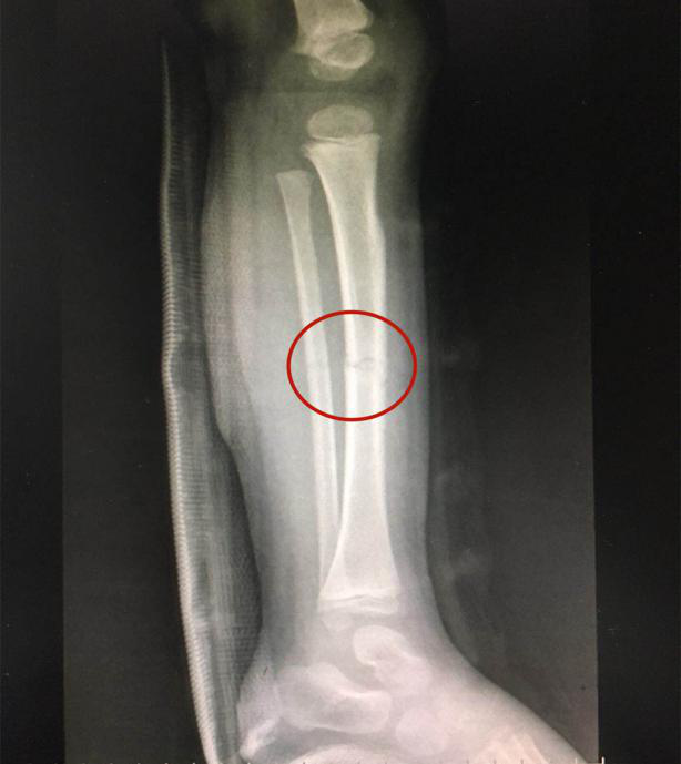 经当地医院照X光显示,橦橦左胫腓骨中段骨折,建议全身麻醉下行弹性髓内钉手术。