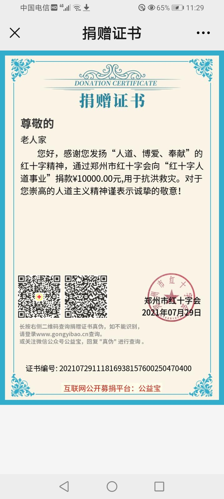 7月29日,90岁高龄的泸州市中医医院离休老干部、73年党龄的老党员章执祥将1万元捐款捐赠给郑州市红十字会,用于抗洪救灾。