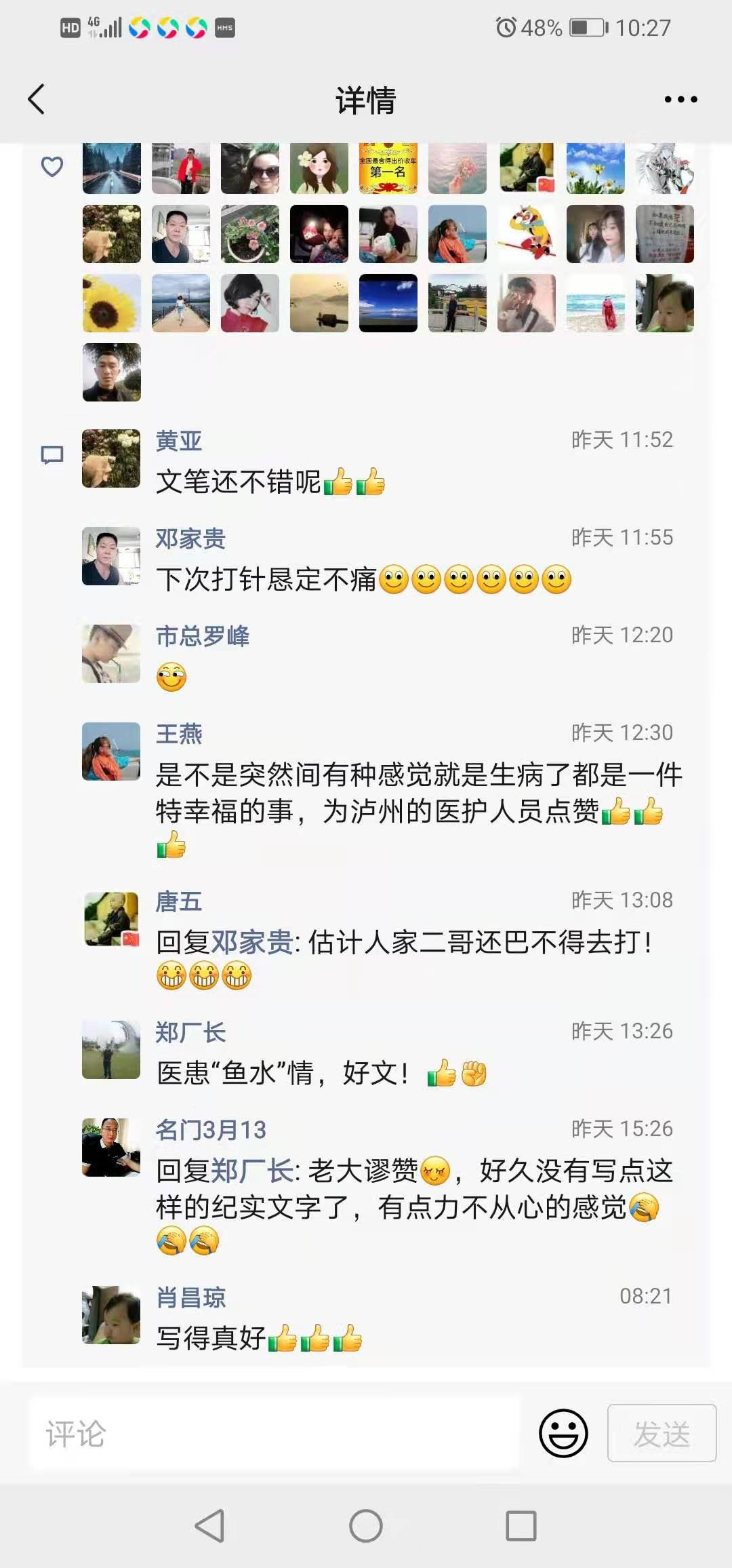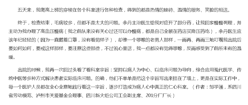 患者邹学通,四川省劳动模范、泸州市关爱基金会理事、四川新火炬公司工会副主席、201分厂厂长。和他进行交流时,他表示,来泸州市中医院心内科就诊,心情从忐忑、紧张变化到放心、舒心最后升华到感动、幸福,因此,他一定要将这种良好的就医体验感写下来并分享出去,出院后,他主动将文章实名投稿给了媒体,并将文章扩散到朋友圈,得到了“圈”内人士的纷纷好评。