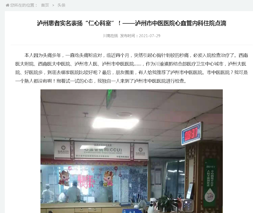 《泸州患者实名表扬“仁心科室”!——泸州市中医医院心血管内科住院点滴》全文内容如下: