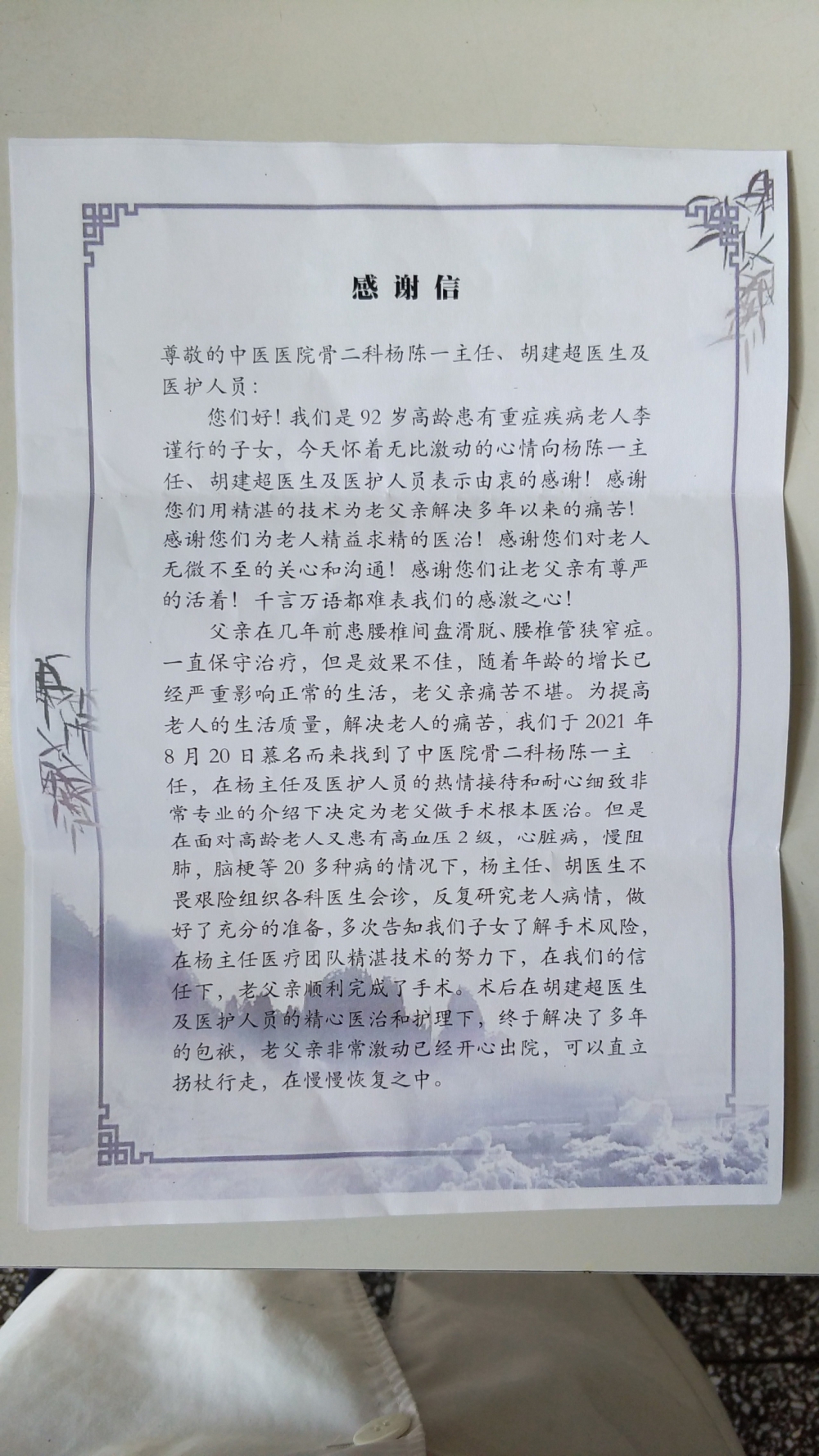 泸州市中医医院组织骨科、心衰中心、麻醉科等专家一起会诊了八次,也把手术风险告知了李谨行老人的家属。就在大家都犹豫不决时,李谨行老人找到医生,他拉着医生的手问:“我的骨头还有没有用?如果我下不了手术台,那我就把遗体捐献了,需要签什么字吗?”医生们安慰他,手术都还没做呢,就别想着身后事。
