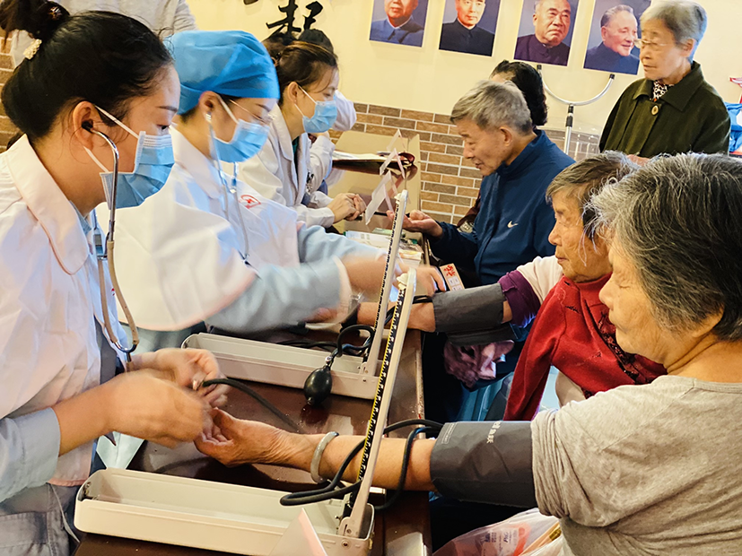 医务人员为来到现场的居民进行免费查血压、健康咨询,还向他们赠送中医文化纪念品。义诊活动在融洽、欢乐的氛围当中进行,随后社区居民还一起合照、做游戏。