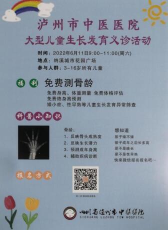 6月11日,来纳溪城市花园广场吧!泸州市中医医院城南院区将在此开展大型儿童生长发育义诊活动,通过专业骨龄检测仪器,方便快捷,辐射基本忽略不计。免费为3—16岁儿童免费测骨龄,进行矮小症、性早熟等儿童生长发育异常筛查。