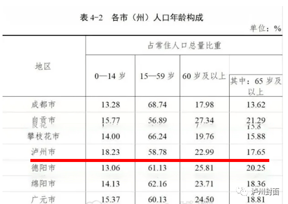 第七次全国人口普查数据显示,泸州市60岁及以上人口约97.8万人,占比达22.99%,其中65岁及以上人口占比高达17.65%,老龄化程度在四川范围内高居“第四”。