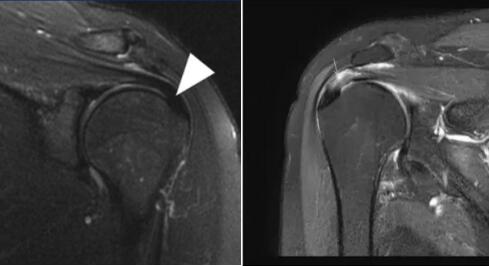 正常肩袖核磁共振图像 肩峰撞击后导致肩袖上表面撕裂