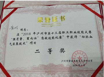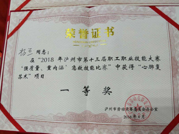 2018年4月8日,由泸州市卫生计生委主办,泸州市护理学会急诊急救专业委员会承办的“泸州市第十三届职工职业技能大赛急救技能比赛”在西南医科大学附属医院门诊部一楼大厅举行,我院选手在比赛中分获个人单项奖一、二、三等奖,团体奖二等奖。