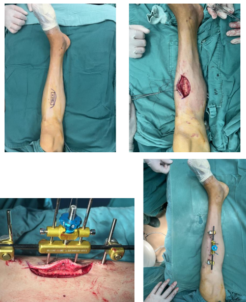 今年7月,由骨伤一科主任汪永泉带领手术团队,为患者实施了左侧胫骨横向骨搬移术。术中,在其左侧小腿胫骨内侧进行截骨,置入4个针道,安装外固定架,手术历时1小时左右顺利完成。经过耐心指导外架调整,患者带着外固定架回家去休养。