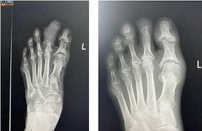 今年5月,赵阿姨在地里栽红苕时,左脚第二足趾被鞋子磨破,起了个水泡,并逐渐发生肿胀、溃烂,在当地治疗一个多月不见起色,后随着感染加重,第二脚趾已肿胀如大脚趾一般大小,甚至长度更甚,脚趾皮肤、肌肉、骨骼均出现了发黑、化脓、糜烂,导致下肢站立疼痛,行走时步态跛行。
