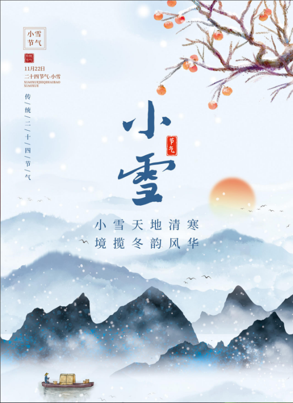 立冬之后,迎来小雪。它是二十四节气中的第20个节气,冬季第2个节气,时间在每年公历11月22或23日。小雪是反映降水与气温的节气,它是寒潮和强冷空气活动频数较高的节气。小雪节气的到来,意味着天气会越来越冷、降水量渐增。
