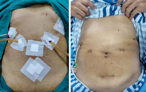 手术如期顺利实施,首先在患者腹部开了5个0.5到1.2cm的小孔,然后在腹腔镜下完成肿瘤的根治性切除,精细完成胆肠、胰肠、胃肠吻合重建,术中出血仅100ml。术后第三天患者即可自行下床活动,无任何并发症,中医特色技术促进患者康复,仅一周的时间顺利出院,比传统开刀手术缩短了近10天左右的时间。