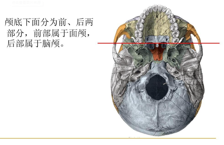 颅底(也称为腔隙底)是颅骨中的基底部分,它支持着脑部,并连接着面部、口鼻、眼睛、喉咙和颈部的结构。它是由多块骨头组成的,这些骨头之间形成了一系列的骨缝和孔洞,这些孔洞是脑部神经和血管穿行的通道。颅底因孔、管、裂众多,位置深,与颅内外结构关系密切,且为神经、血管进出颅通道。颅底肿瘤通常是高难度手术,特别是靠近脑干附近的手术。