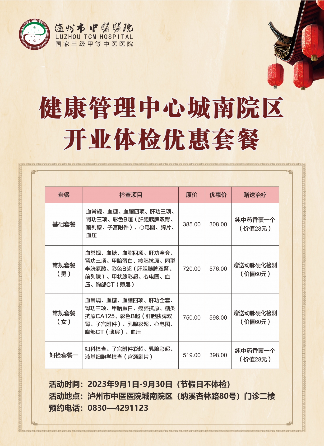 泸州市中医医院体检中心拥有先进的医疗设备,包括高级影像设备、实验室分析仪器等,能够进行全面的体检项目,帮助您了解自身的健康状况。我们的医护团队经验丰富,专业的技术和温暖的服务将让您感到宾至如归。为此,向大家准备了一系列的体检优惠套餐。