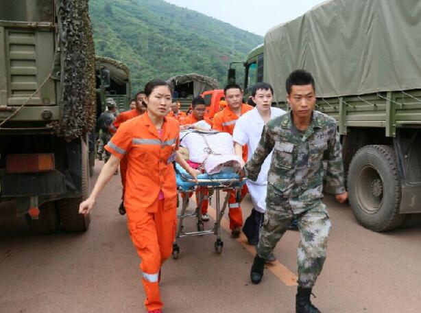 莫玲玲(左一)和队员们正在紧急转移伤员