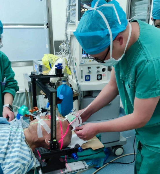 在征得家属同意后,市中医院神经外科团队在谢勇主任的带领下,经过详细分析,决定采用“激光精准定位颅内血肿穿刺抽吸外引流术”的微创手术方式来解决辜先生的问题。
