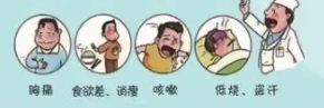 主要是咳嗽咳痰2周及以上或痰中带血,此外还可能有低烧、夜间盗汗、午后发热、胸痛、疲乏无力、体重减轻、呼吸困难等症状。