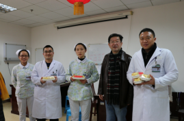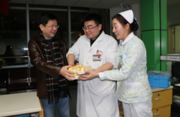 “年三十晚上还在工作,大家辛苦了!”“给大家拜年了!”…… 手捧蛋糕,听到院领导一声声亲切的问候,大家感到格外温暖和温馨。“谢谢领导的关心和慰问,医院里的‘年’味是甜的啊!”一位年轻的医生说。