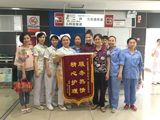 患者家属与内二科护士长(左四)及其他医护人员合影