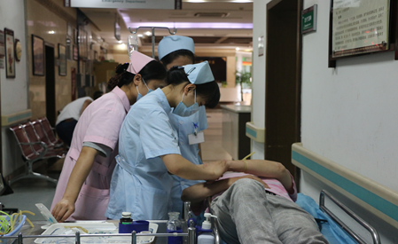 急诊科护士仔细地为急诊患者扎针输液