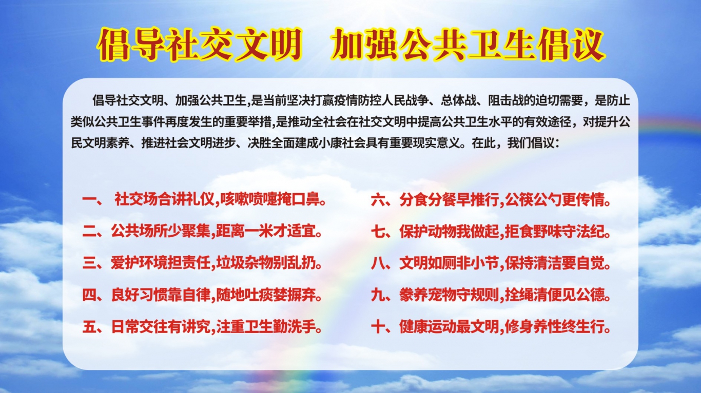 倡导社交文明、加强公共卫生,是当前坚决打赢疫情防控 人民战争、总体战、阻击战的迫切需要,是防止类似公共卫生 事件再度发生的重要举措,是推动全社会在社交文明中提高公 共卫生水平的有效途径,对提升公民文明素养、推进社会文明 进步、决胜全面建成小康社会具有重要现实意义。在此,我们 倡议:-、 社交场合讲礼...