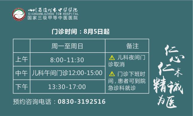 为有效缓解群众看病难问题,方便广大患者来院就医,提升患者就医体验,8月5日起,泸州市中医院将调整门诊时间。请大家把小本本拿出来记好哦!文/姜莎莎