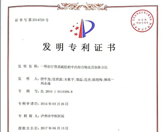 近日,我院自主研发的“一种治疗骨质疏松的中药组合物及其制备方法”被国家知识产权局授予发明专利证书。这是我院获得的首项发明专利,我院骨伤科大科主任唐中尧为该专利研究的负责人。该成果明确了该组方的制备工艺,为骨质疏松患者提供了一种新的治疗方法。 据悉,一直以来,我院始终秉承医教研协...