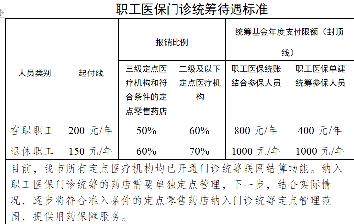 一是起付标准:一个自然年度内,在职职工、单建统筹人员的起付线为200元,退休职工为150元。二是支付比例:政策范围的普通门诊医疗费用统筹基金支付比例为三级定点医疗机构和定点零售药店50%、二级及以下定点医疗机构60%,退休人员在上述相应支付比例基础上增加10个百分点。三是最高支付限额(职工门诊统筹年度支付限额是指一个自然年度内,职工医保基金最多可为参保人员报销的金额,超过年度支付限额后,医疗费用全部由参保人员自己承担):分两种情况,一种是按统账结合方式缴费的在职人员(即缴费比例为9%的人员)和退休人员,年度支付限额分别为800元和1000元;另外一种是按单建统筹方式缴费的人员(即缴费比例为6.3%的人员),年度支付限额为400元。