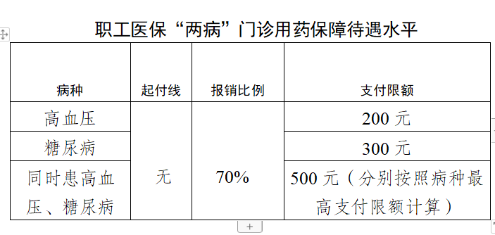 2.建立职工医保“两病”门诊用药保障制度。经定点医疗机构按诊疗规范确诊为“两病”且未达到门诊特殊疾病标准的职工医保参保患者,备案后即可享受“两病”门诊用药保障政策。“两病”患者门诊用药范围为《国家基本医疗保险、工伤保险和生育保险药品目录》内直接用于降血压、降血糖的治疗性药物。“两病”患者在定点医疗机构门诊使用符合上述规定范围的医药费,不设起付线,统筹基金按70%比例支付,年人均最高支付限额高血压200元、糖尿病300元,同时患高血压、糖尿病的,最高支付限额500元。达到门诊特殊疾病标准的,纳入门诊特殊疾病管理范围,执行门诊特殊疾病政策,不重复享受待遇。