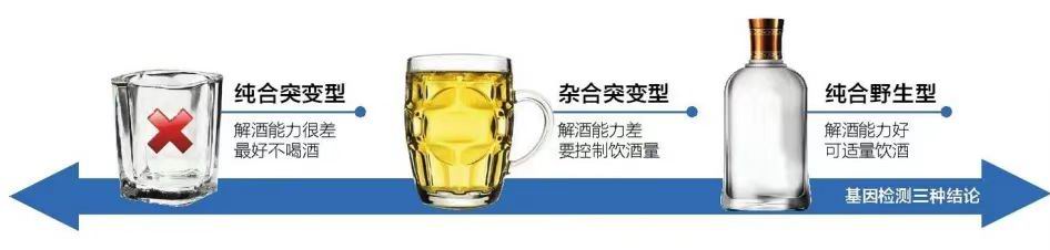 人体的ALDH2主要分三种类型,即纯合野生型(ALDH2*1*1)、杂合突变型和纯合突变型(ALDH2*1*2)(ALDH2*2*2),分别代表三种酒精代谢能力的强弱,也就是解酒能力的强弱,每个人只会有一种类型为阳性。