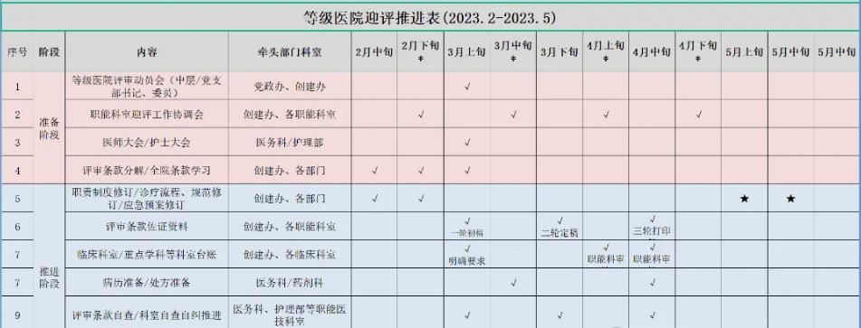 各家医院在迎评启动期,首先要统一认识:避免以考试的心态应对,为了评审而评审,而是要把评审当作抓手,以评促建、以评促进、以评促精,推进年度重点工作;其次要明确等级评审是一项全院行动、全员参与通力合作才能完成的工作,要发动全体院领导、中层干部、一线员工全流程全方位开展迎评整改工作;同步要制定医院、科室(个人)迎评计划,责任到人,相关职能部门主动检查、督促整改,通过科室自查互查、职能部门督查、院领导巡查,全方位无死角的发现不足,制定对策,持续改进。