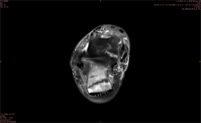 隐性骨折在MRI表现为T1WI序列上见由关节面向骨干走行的形态各异低信号区,有线状、条状、紊乱低信号,信号强度不均匀。与T1WI低信号改变相对应部位在T2WI上表现为相应形状的高、低混杂信号,且部分低信号周围可见高信号水肿改变。STIR序列图像上病灶呈显著高信号,与信号被抑制的临近正常骨髓形成鲜明对比,分界也较T2WI成像更为清楚。脂肪组织抑制技术是MRI的一个重要性能,脂肪抑制技术在MRI应用中可以改善组织对比和增加病变显示机会,这样骨髓的脂肪抑制后就不会有任何信号,而隐性骨折线及骨髓水肿的异常高信号就会更加明显的显示出来。
