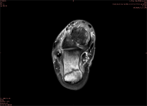 专业解释看不懂没关系,大家看图1和图2就可以了,这是同一个患者跟骨的磁共振和CT图像,图1的红色箭头指示的黑线就是磁共振图像显示的骨折线,一目了然。而对比图2的CT图像上并未显示异常。