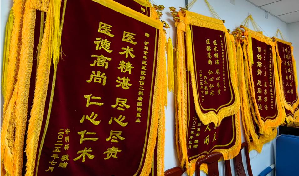 在骨伤二科城南院区的会议室,4枚小小的挂钩,挂着几十面锦旗,锦旗多到挂不下,“老院区更多,很多只能叠放在库房。”但杨陈一却不太在意这些。他说,金杯银杯不如老百姓的口碑。“患者觉得你好,才是真的好。”