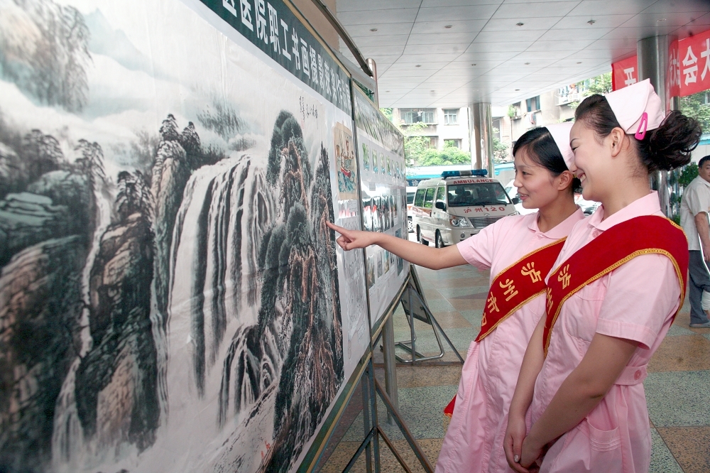 庆“七一”书画摄影比赛护士作品选 左:肖言洁(骨一科)中:张莉莉(骨一科)右:慕冰楠(手麻科) 被外宾大为赞赏的护理部主任彭闺臣的十字绣作品 摄影展板,有部分护士作品。 书法展板,有部分护士作品 护理部袁虹作品 护士在观看展览